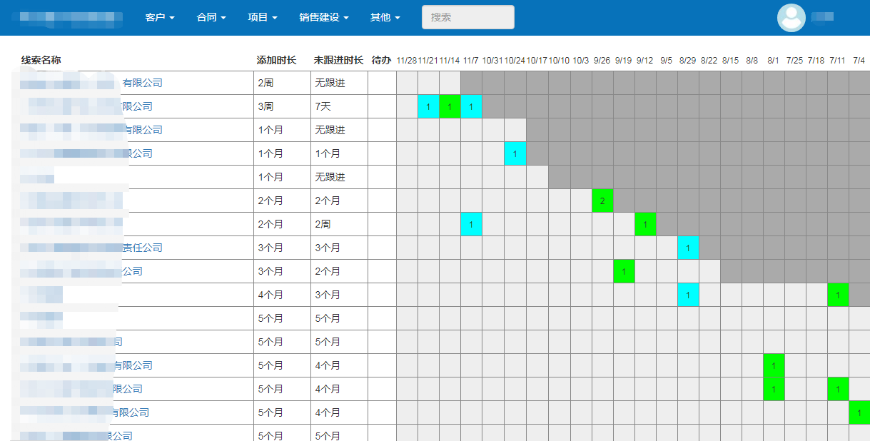 上面的表格展示每个线索在近6个月中的跟进频次,帮助您发现没有及时跟进的线索。 每个小格表示一个自然周,深绿色表示本周有见面,绿色表示本周有跟进记录,灰色表示没有跟进。